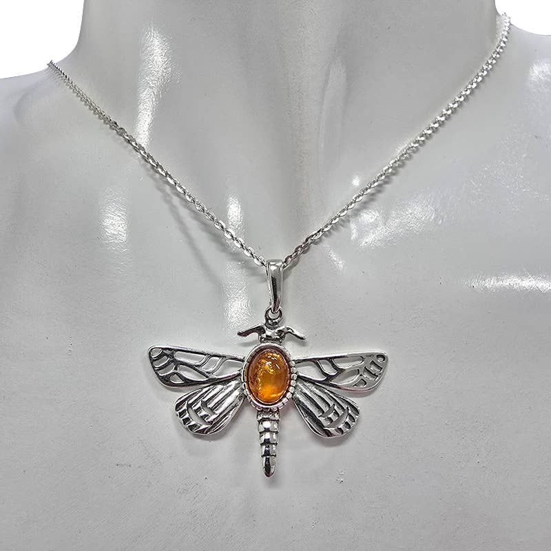 Amber Sterling Silver Dragonfly Pendant. Oval-shaped amber stone set in .925 sterling silver. Genuine Baltic amber.
